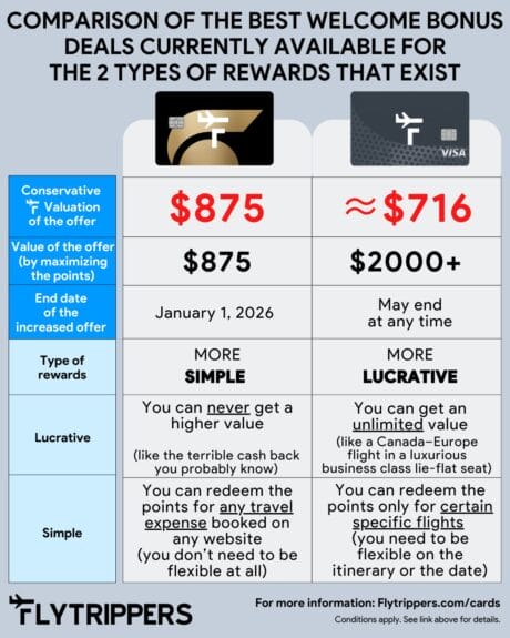 The 2 types of rewards that exist are very different. No matter what you prefer, what’s important is that you take action now. Choose the Scotiabank Gold Amex Card if you want points that give you $875 in a very simple way. Choose the TD Aeroplan Visa Infinite Card if you want points that can give you $2000 to get a much better deal.