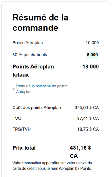 Finalement voici les détails de comment payer pour l’achat de points Aéroplan: