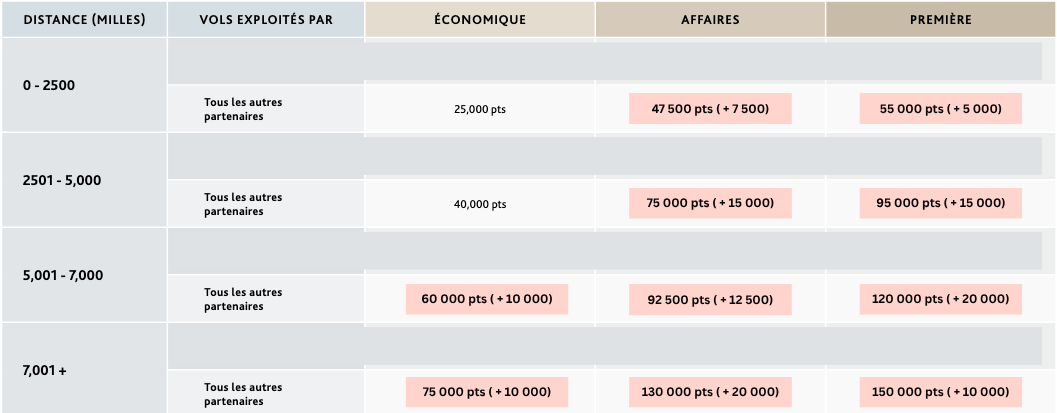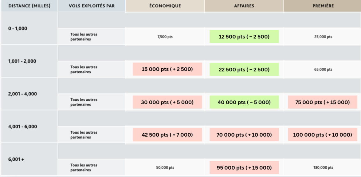 Les tableaux de récompenses Aéroplan changent pour la 1re fois depuis 2020. Les prix fixes garantis augmentent dans plusieurs cas (surtout pour la meilleure utilisation, les vols longue-distance en luxueuse classe affaires), mais ils diminuent dans certains cas. Plus de détails à venir.