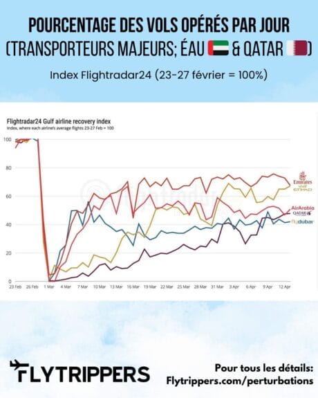 Et Qatar Airways était de loin le plus affecté quand il n’y avait pas de cessez-le-feu, comme tu as pu le voir quand on a partagé le graphique de la reprise (le pourcentage de vols opérés par rapport à l’horaire normal d’avant-guerre).