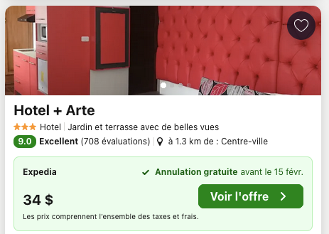 Par exemple, l’Hotel + Arte (coté 9,0/10) avec un excellent emplacement au centre-ville de Quito est juste 34 CAD par nuit (17 CAD par nuit par personne avec un compagnon de voyage).