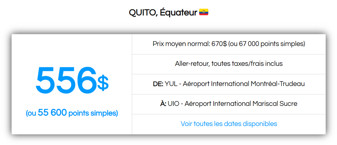Voici les prix (en points) les moins chers repérés pour les nouvelles liaisons Canada–Équateur: