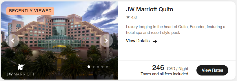 Si tu veux te gâter avec une propriété plus chic, il n’y a pas d’option géniale pour utiliser tes certificats de nuit gratuite Marriott parce que les hôtels de luxe ne sont pas si chers. Par exemple, le JW Marriott Quito est 246 CAD par nuit.