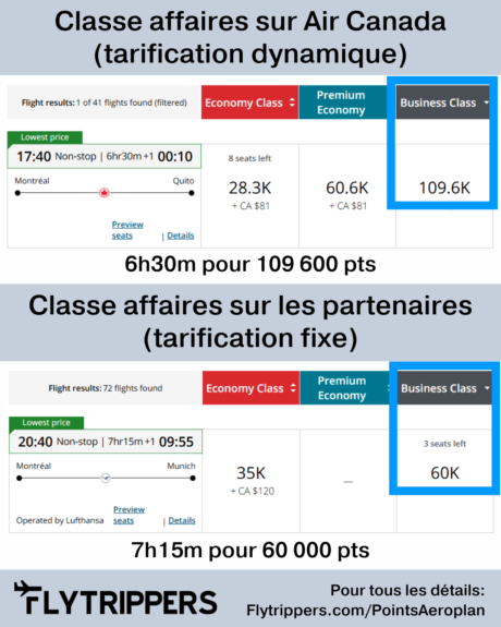 Ce sont les meilleurs points… mais c’est tellement mieux de les utiliser pour des vols sur les transporteurs partenaires Aéroplan, qui ont une tarification fixe (prix garantis). Les vols sur Air Canada ont une tarification dynamique (prix variables), donc tu vas rarement obtenir une valeur démesurée comparativement au prix en argent.