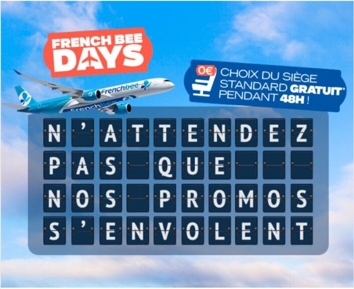 French bee a une promotion intitulée «les French bee Days» (oui, même en français… c’est très typiquement Français, ça). Tu pourrais vouloir en profiter si tu veux aller n’importe où en Europe (et pas juste en France) et si tu veux un siège préchoisi pour le long vol.
