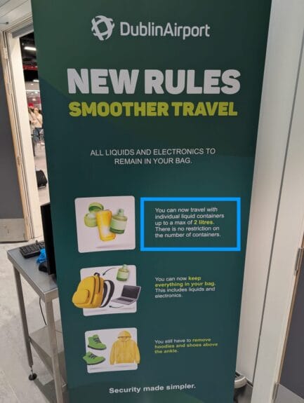 Comme lors de mon passage à Dublin, les nouvelles règles permettent une taille maximale de 2L pour les contenants de liquides, et il n’y aucune limite au nombre de contenants de liquides permis. Tu n’as pas besoin de les sortir au contrôle de sécurité non plus.