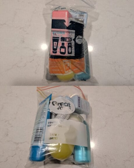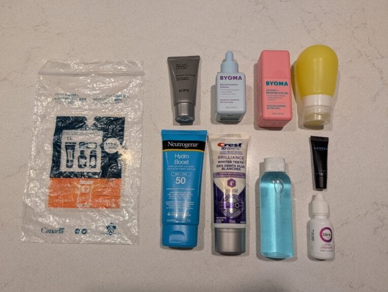 Ça aide pour les voyages en Europe, mais c’est honnêtement déjà assez facile de voyager avec des bagages de cabine seulement, avec environ 10 contenants de liquides de 100mL (et même 20 si tu veux vraiment). Je le fais toujours, et j’ai pris 600+ vols. Astuces à la fin de cet article.