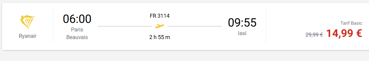 Les vols Paris–Roumanie les moins chers (aujourd’hui) sont à 14.99 EUR avec la vente Ryanair. Sans escale.