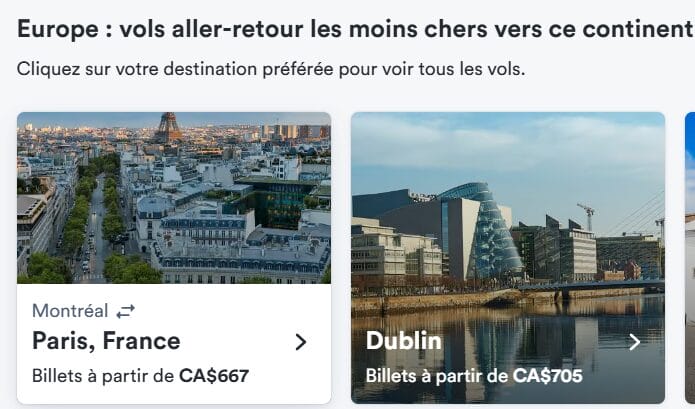 Les vols les moins chers (aujourd’hui) pour traverser l’océan sont Montréal–Paris, à 667 CAD aller-retour. Sans escale.