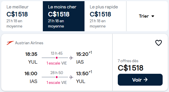Si tu fais comme 99% des gens et que tu réserves tristement tes vols sur 1 seul et même billet, ça va parfois te coûter 1518 CAD si tu veux au maximum 1 arrêt. Les vols directs n’existent pas (reviens-en de toujours vouloir des vols directs, si tu veux être un pro des voyages 😉)!