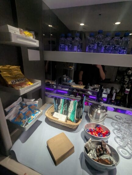 I would add that I like the idea of the small self-service station with snacks that complements the meal services well; I wish every airline had this. There’s also some beverages, but I’d rather ask the flight attendant for that, for more options.