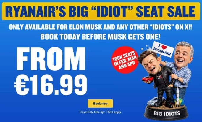 We’ve already told you about the epic work Ryanair’s social media team does, and this time it even gave birth to the current “Big Idiot Seat Sale”. Indeed, it’s to highlight the feud between Elon Musk and Ryanair that this name was chosen for the flash sale, which has flights for 17 EUR (an excellent example of why the self-transfer trick is awesome).