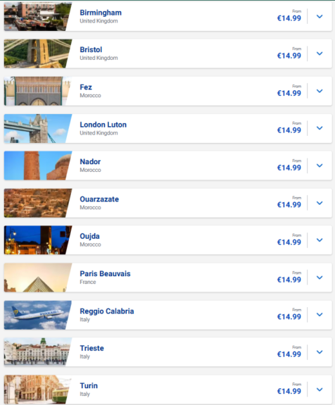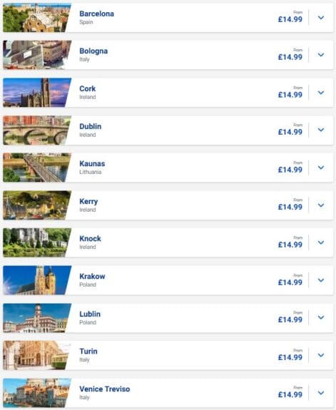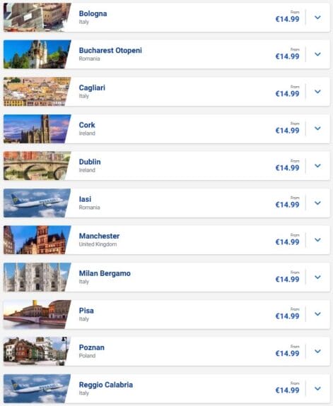 It’s easy to see the prices on the Ryanair sale page, as mentioned. But here are some examples for cities that are often the best for the self-transfer trick.