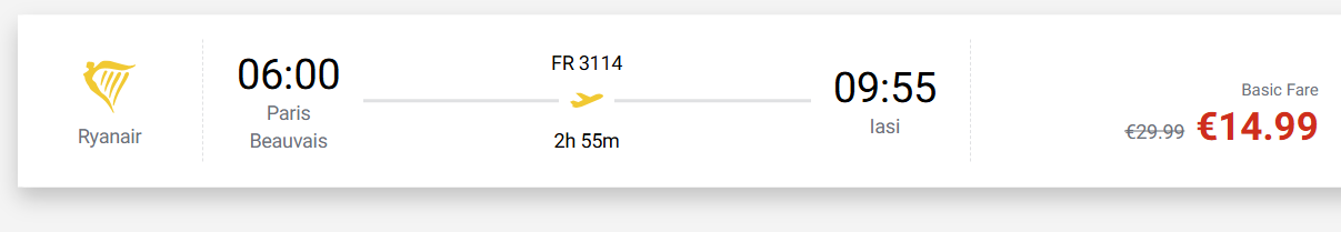 The cheapest Paris–Romania flights (today) are 14.99 EUR with the Ryanair sale. Nonstop.