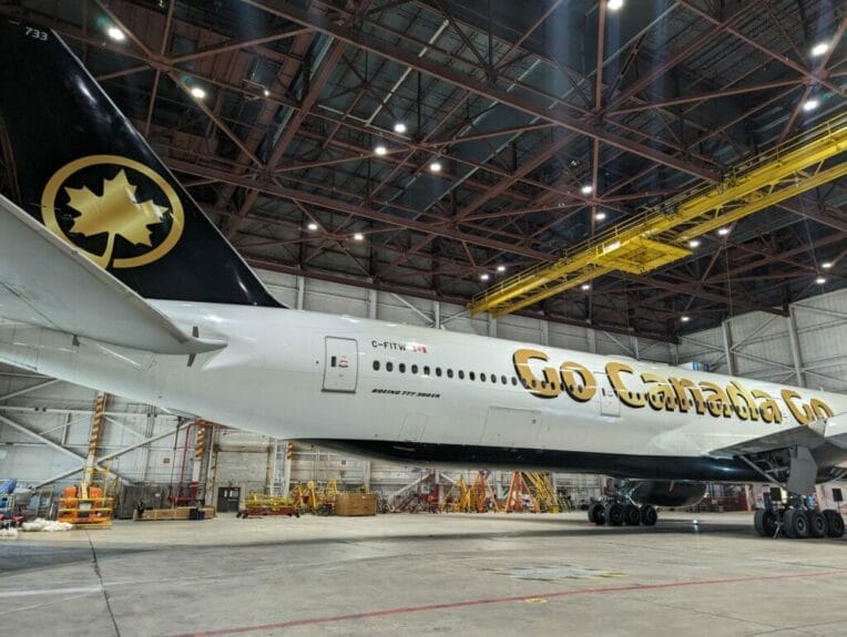 The livery is on an Airbus A330-300. It’s Air Canada’s regular livery, with some modifications. The coolest is the maple leaf roundel on the tail that is gold instead of red (a nice touch).