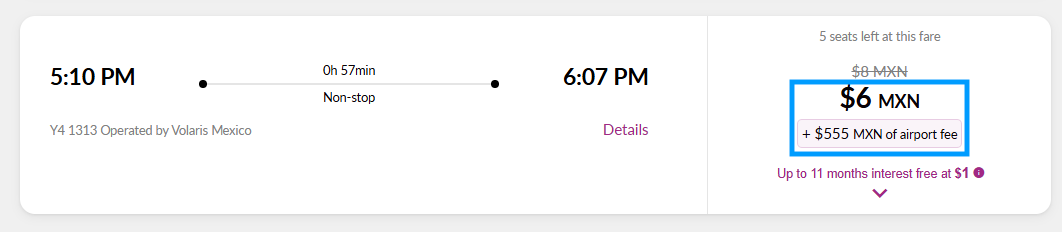 It’s worth mentioning one of the craziest ratios between airfare and taxes I’ve ever seen in my life! Fare of 6 MXN, but taxes of 555 MXN!